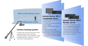 С помощью виртуального движка или сервера рендеринга можно создать бесконечное пространство, не ограниченное светодиодным экраном, создавать различные сцены и обеспечивать быструю смену сцен в соответствии с различными требованиями виртуального производства. Актеры или ведущие взаимодействуют с окружающей средой в иммерсивном пространстве и создают настоящие фильмы и шоу с помощью конвергентного сервера.