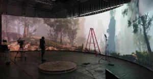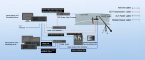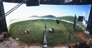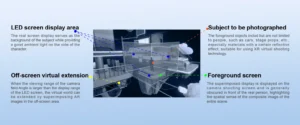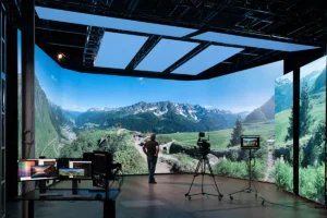 В XR-проектах высококачественный светодиодный экран (обычно трехсторонний или изогнутый) одновременно отображает виртуальную 3D-среду, предварительно загруженную движком рендеринга (часто использующим Unreal Engine или Notch), и эти светодиодные экраны служат фоном для киносъемки или прямого эфира. При добавлении системы точного слежения за камерой, камера начинает плавно перемещаться вокруг реальных и виртуальных элементов, объединенных в светодиодной среде, создавая у зрителя иллюзию интеграции и погружения благодаря перспективе камеры.